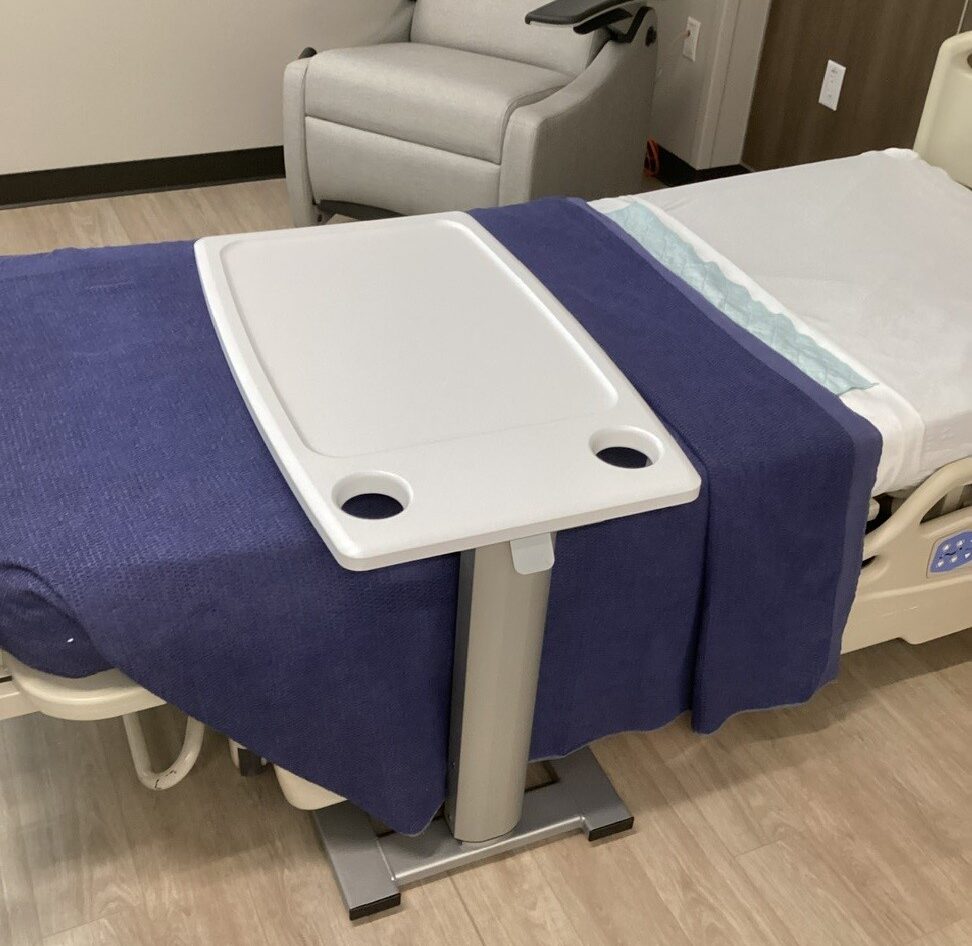 Top surface can be raised/lowered with one hand. Activation lever conveniently located for patient and caregiver use and used only for lowering table height. Top surface has eased edge for patient comfort. The angle of the patented optional shelf is designed for easy retrieval of items. Having personal items conveniently within reach assists patient’s connection/control with their environment. Ships are fully assembled in recyclable packaging.